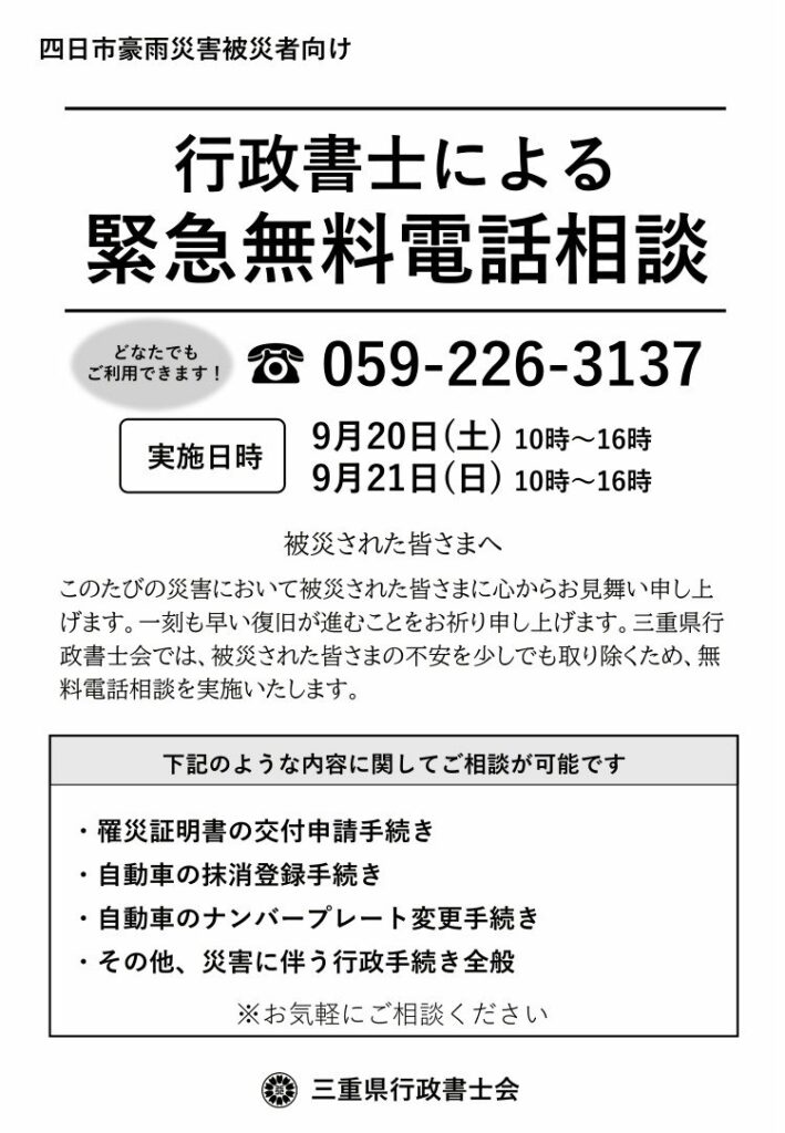 三重県行政書士会は、被災者向けに緊急無料電話相談窓口(添付資料)を開設しました。お気軽にご相談ください。