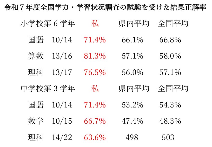 3つ目の「学校は何をすべきところかについて」では、令和7年度全国学力・学習状況調査の問題を自分で解いた結果を紹介します。小中学校の問題とはいえ、難しかったです。